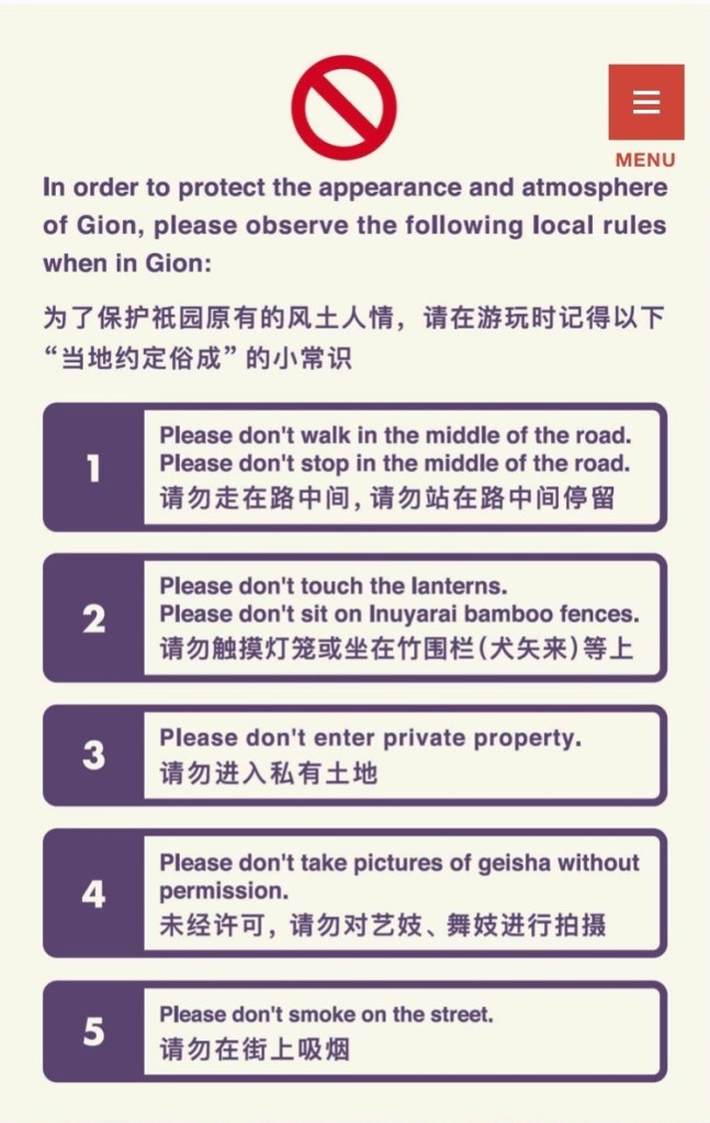 The Japan Times reported that through a questionnaire answered by local residents, most misbehaving tourists are guilty of following and taking pictures of geisha and maiko (apprentice geisha), trespassing on private property, and generally being in the way while taking a pic for the ‘gram.