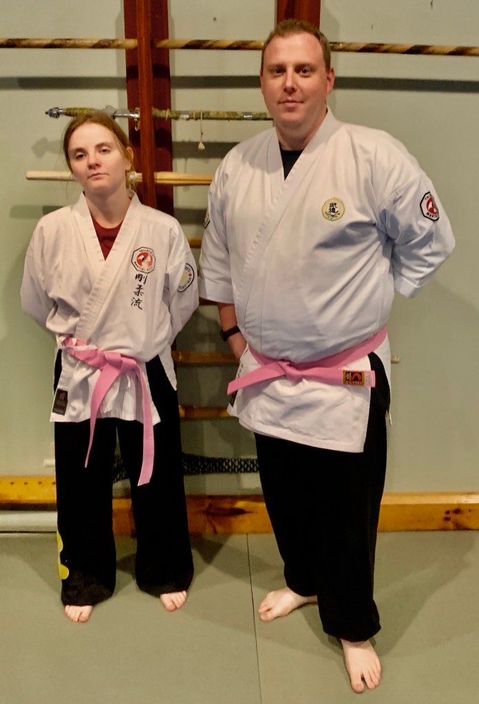 With tremendous thanks for a gracious donation and presentation by Hanshi Alex Atkinson this past Saturday, Tallack Dojo instructors Jennifer and Kyle received Pink Belts for Breast Cancer Awareness month. They will be wearing their belts for the remainder of the month in support of Breast Cancer Awareness and Research, and to also provide support to the cause by collecting donations until the end of October.