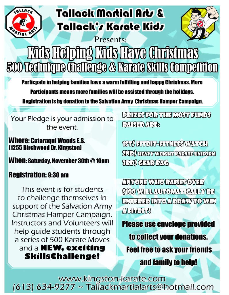 This week we will be handing out our envelopes for our upcoming 500 Technique Challenge & Salvation Army Fundraiser, we look forward to seeing you all at Cataraqui Woods Elementary School on Saturday November 30th to help out with this wonderful event!