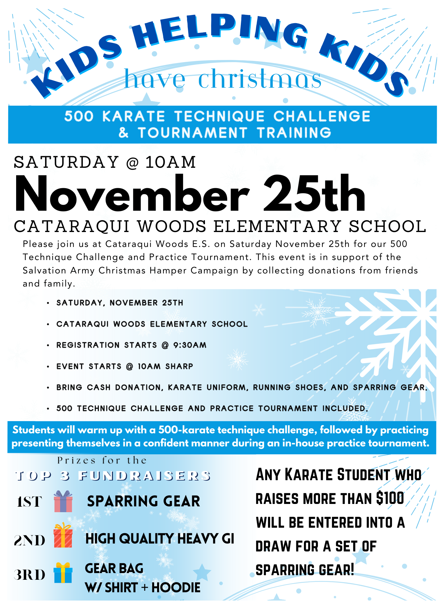 Please join us at Cataraqui Woods E.S. on Saturday November 25th for our 500 Technique Challenge and Practice Tournament. This event is in support of the Salvation Army Christmas Hamper Campaign by collecting donations from friends and family.
